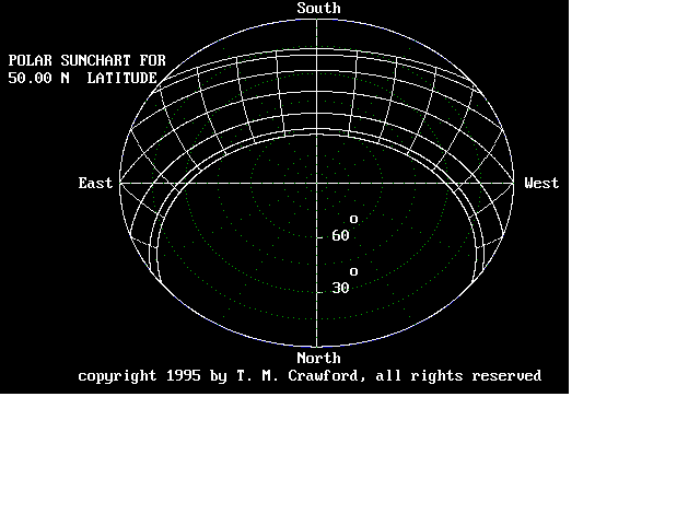 Figure 2 shows a typical polar sunchart for 50 degrees north latitude. |