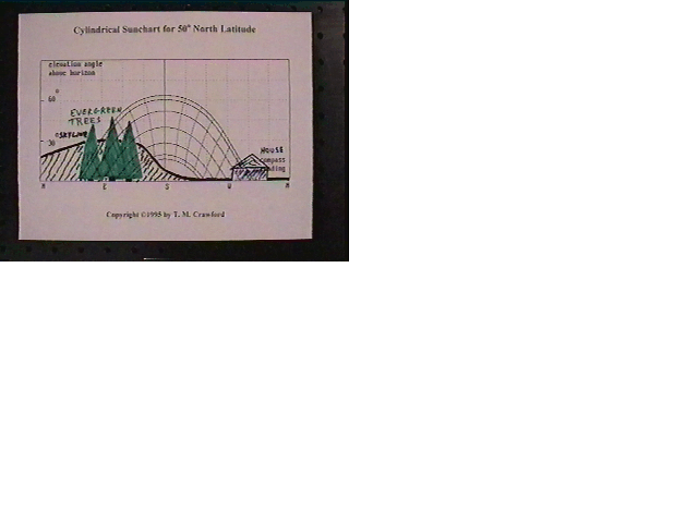 Geographical obstacles are sometimes unavoidable. Many times, a portion of the sunchart may be blocked by a large object which cannot be removed or compensated for by changing locations. An example of this may be a large hill, mountain, building, or stand of trees. As mentioned above, figure 3 shows examples of these situations. If this occurs and no better building site is available, then the sunchart can be used to help orientate a building or solar collector to optimize the sun's energy that the collector receives. Using the sunchart with the appropriate skyline plotted onto it, approximate with your eye the azimuth angle at which the most direct light falls onto your window or collector. Orientate your building or solar collector accordingly. In the example shown in figure 3, a hill and some trees block the morning sun in the winter until about 11:00 AM solar time. A solar collector would need to be turned about 15 degrees west of south to make the best use of the sun's rays.