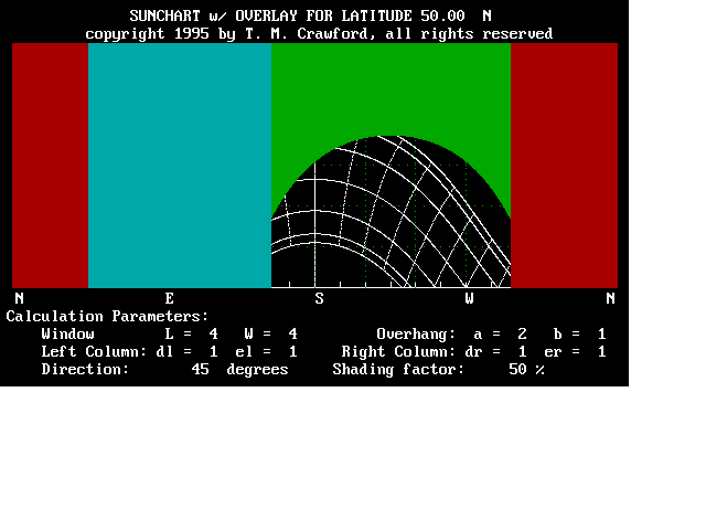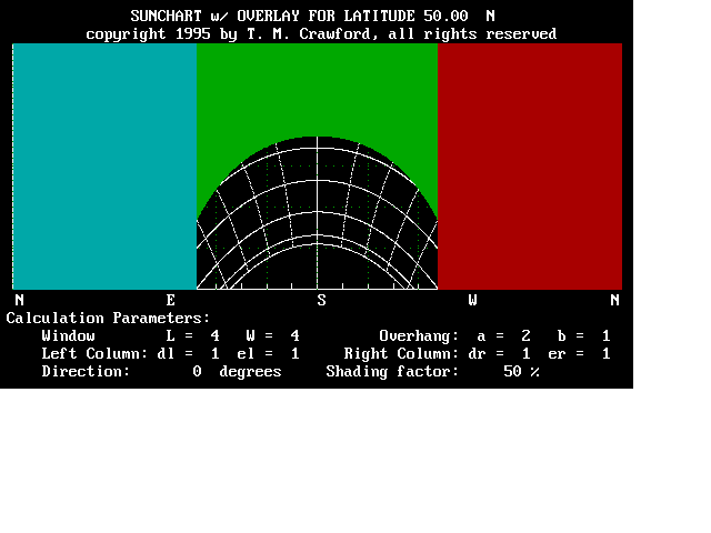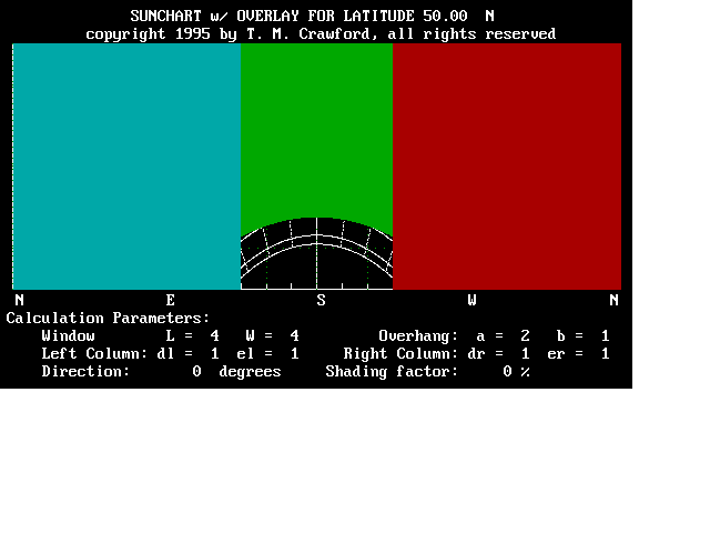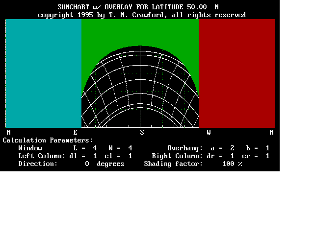 The sunchart can also be used to perform shading design calculations. In many cases, passively solar heated buildings can be designed to collect solar energy during the cold fall and winter months, and yet, through the use of shading devices, reject the sun's energy during the hotter spring and summer months. The sunchart is a useful design tool for these applications. Two basic types of shading devices are used for this purpose. Horizontal overhangs, if properly designed, shade much of the window during the summer months when the sun is high in the sky, while letting in most or all of the sunlight during the winter months when it is a useful heat source. Vertical columns along side a window can also be used to shade the window during the summer months while letting sunlight through during the winter months. Plants properly located can also be useful to block summer sun while allowing winter sun through. With some geometrical knowledge, and a little patience, one can plot out the effects of these and similar shading devices on the sunchart. Computer software can also perform these shading calculations and plot them directly onto the sunchart.
